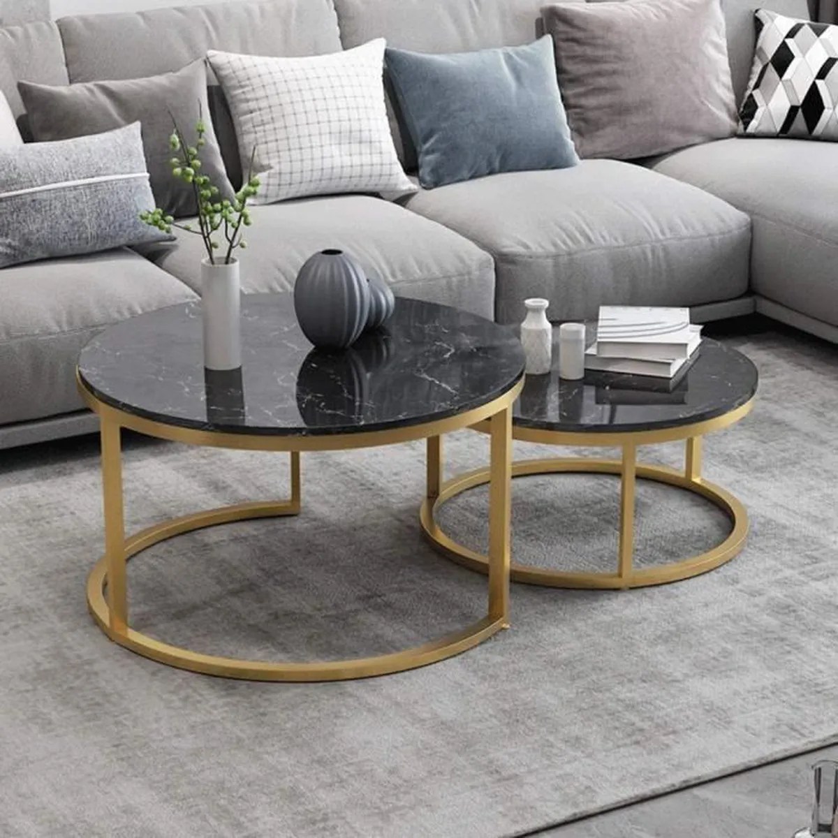 - Tables empilables pour le salon – Cet ensemble moderne de 2 tables d’appoint rondes est composé d’un plateau en marbre et de pieds en métal. Il se compose d’une grande et d’une petite table d’extrémité.